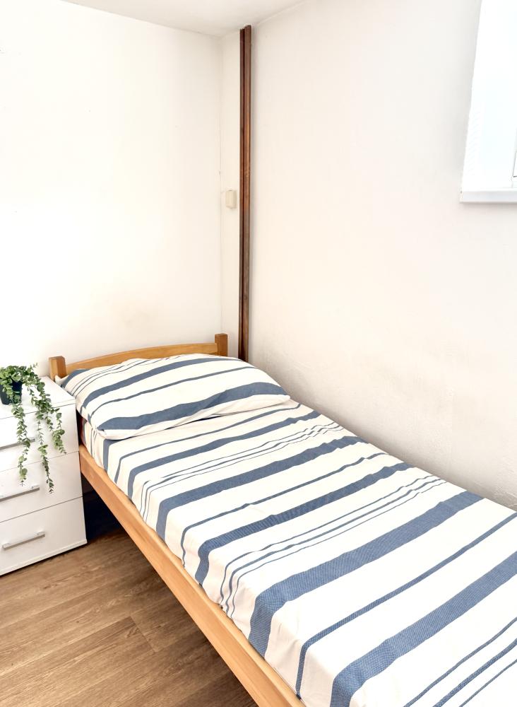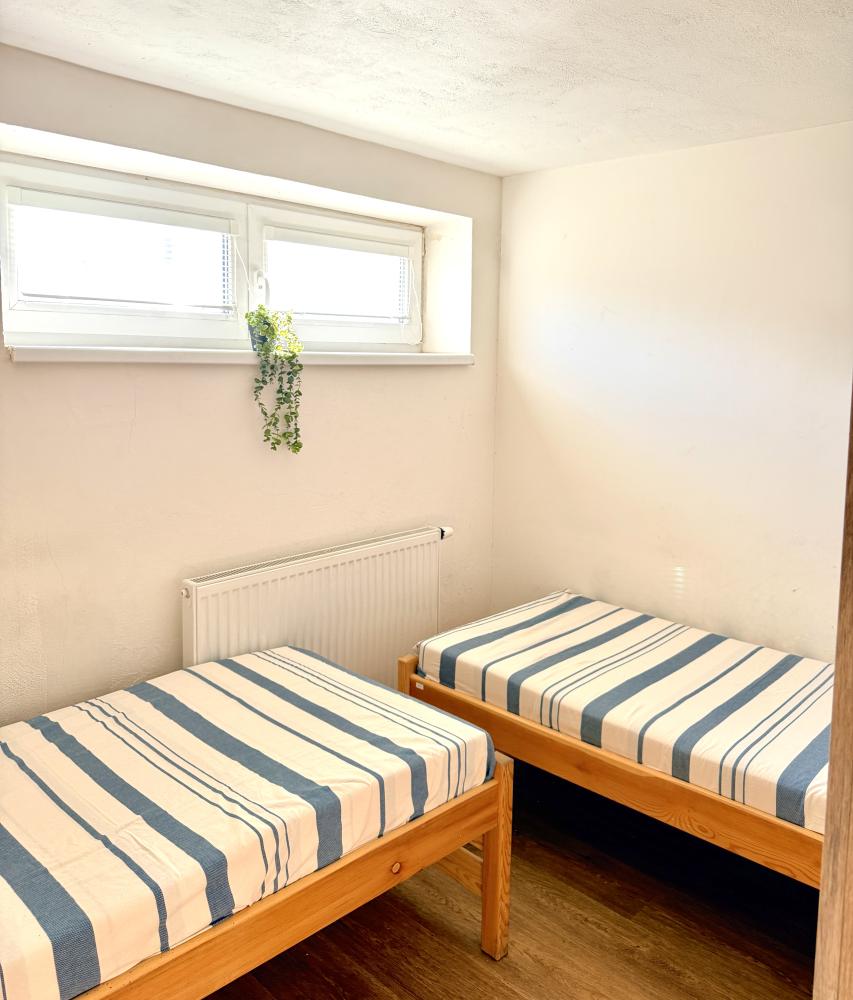Světlá a útulná místnost ideální pro přátele, kolegy nebo pár. K dispozici jsou dvě pohodlné samostatné postele a základní úložný nábytek. Hosté mají přístup do čisté, sdílené koupelny se sprchou a toaletou, která se nachází na stejném patře v chodbě. Ložní prádlo a ručníky jsou zahrnuty v ceně pobytu. Pokoj nabízí také bezplatné Wi-Fi, topení a přístup do sdílené kuchyňy