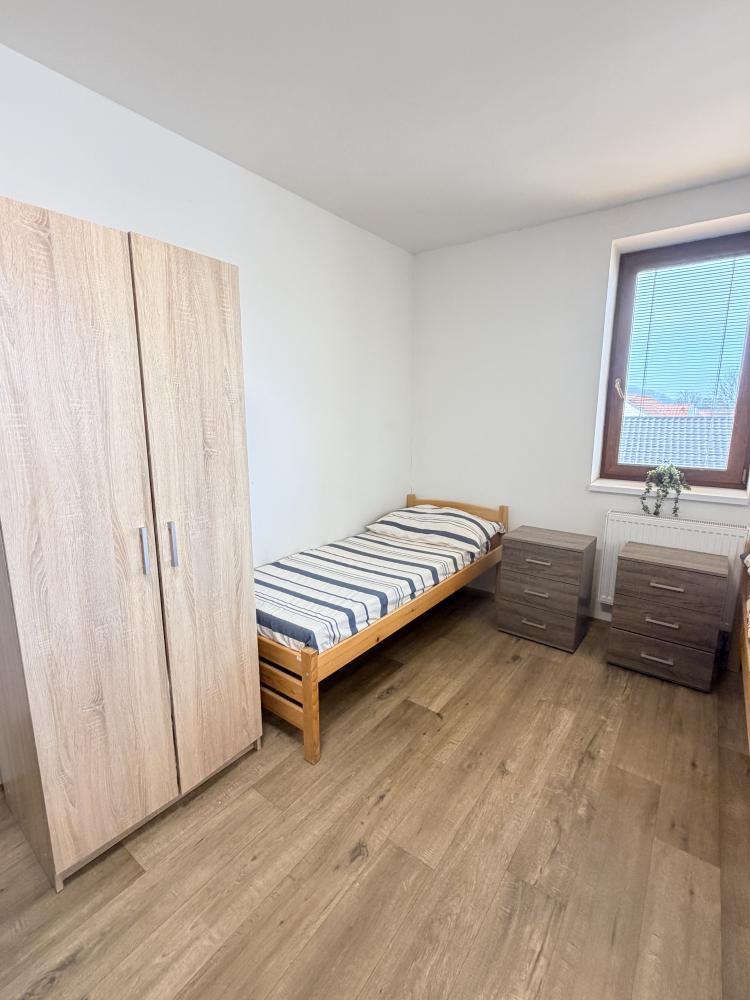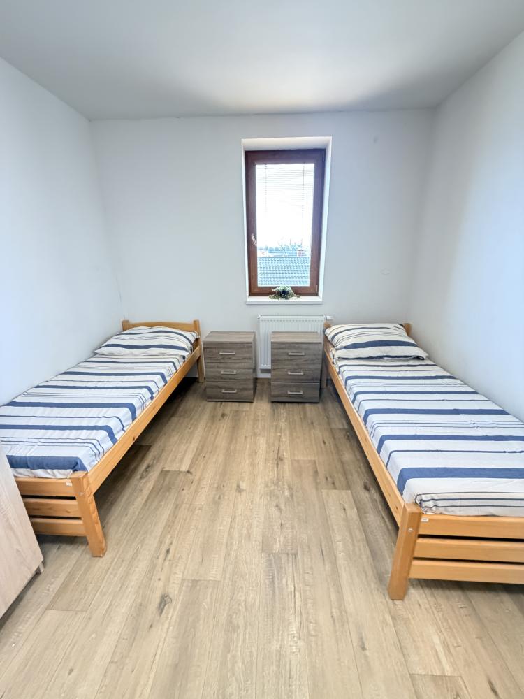 Prakticky zařízený dvoulůžkový pokoj ideální pro pár, přátele nebo kolegy. Nabízí dvě oddělená pohodlná lůžka, základní úložný prostor a příjemné prostředí pro odpočinek. Koupelna a toaleta jsou sdílené, umístěné na stejném patře v chodbě a pravidelně udržované v čistotě. Ložní prádlo a ručníky jsou v ceně ubytování. Samozřejmostí je bezplatné Wi-Fi a topení. Hosté mohou využít sdílenou kuchyňí vybavenou lednicí,